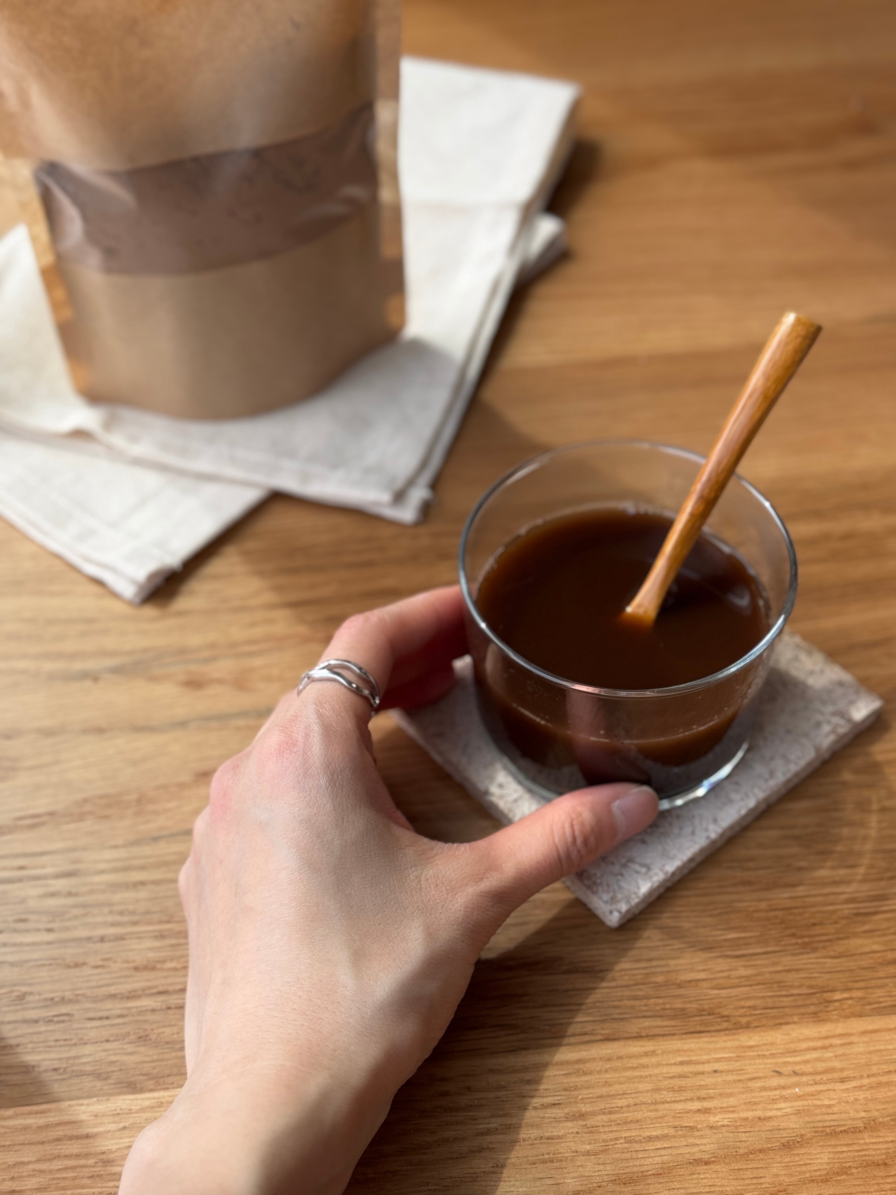 温めた豆乳や牛乳を加えれば、まろやかなカフェラテ風に。はちみつをひとさじ足すと、やさしい甘さのほっこりドリンクになります。ホットでもアイスでも、お好みのアレンジでお楽しみください。